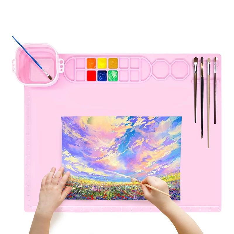 Tapete de silicona para dibujar y hacer manualidades para proteger tu campo de trabajo. Incluye pinceles y baso para lavar tus brochas.
